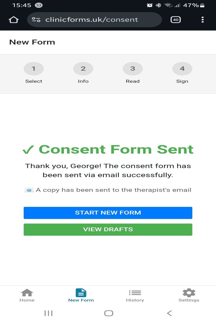 Most therapists spend too much time printing, storing, and organising paper intake forms. ClinicForms removes that stress. Clients complete their forms online before the appointment, and you receive everything directly in your email inbox.